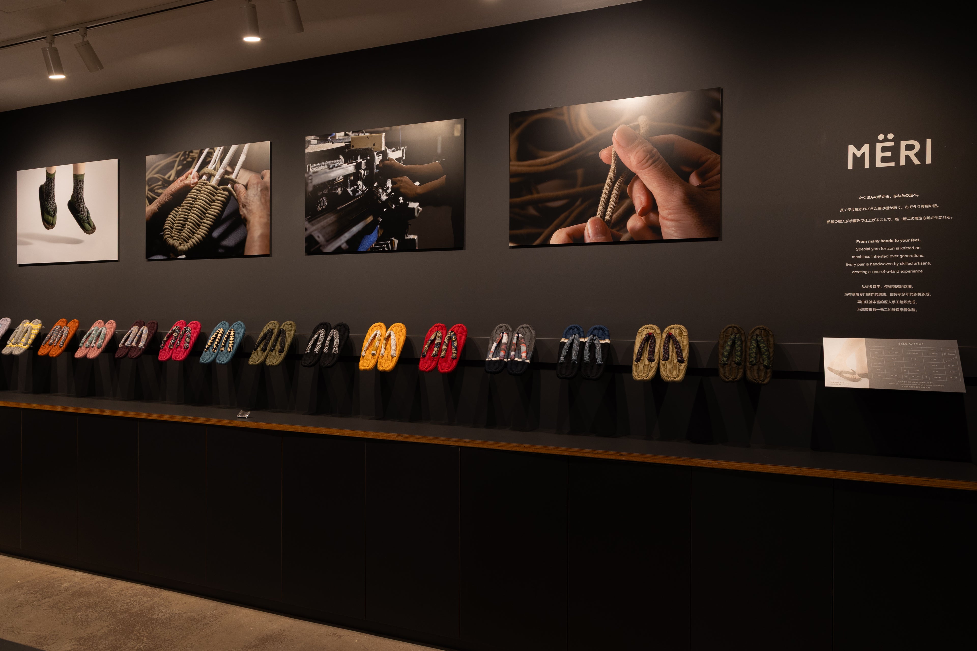 At our directly-operated store, you can actually hold MERI in your hands. It is perfect for those who would like to check the comfort and feel of the materials, or for those looking for a gift. Find your favorite pair while experiencing the gentle texture of the materials and the craftsmanship of our artisans.